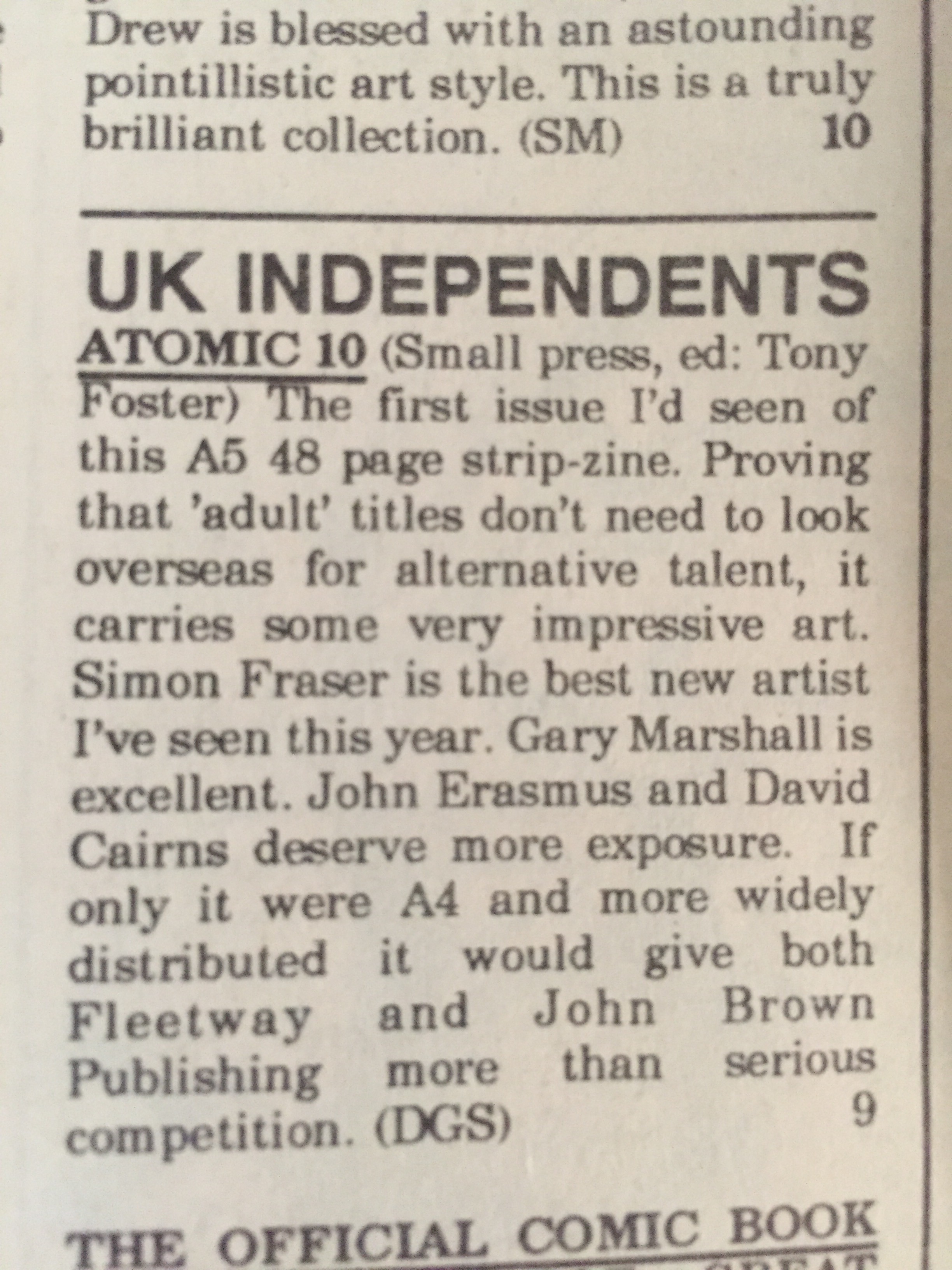 Atomic would go from strength to strength with great work from Garry Marshall, Simon Fraser, David Cairns, John Erasmus, David Johnson, Tom Walbank and John Miller for 13 issues, until January 1992. Particular highlights were ‘the Godmother’, ‘The Girl with the Flowery Trousers’, ‘The Two Dimensional Horror’ and ‘Thievery For Fun and Profit’. The title received rave reviews and published 13 issues in total – soon to be made available again online. You can read more about that at 2000AD and Beyond blog here