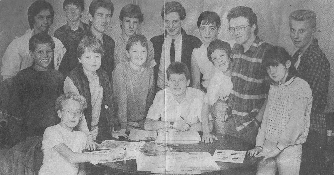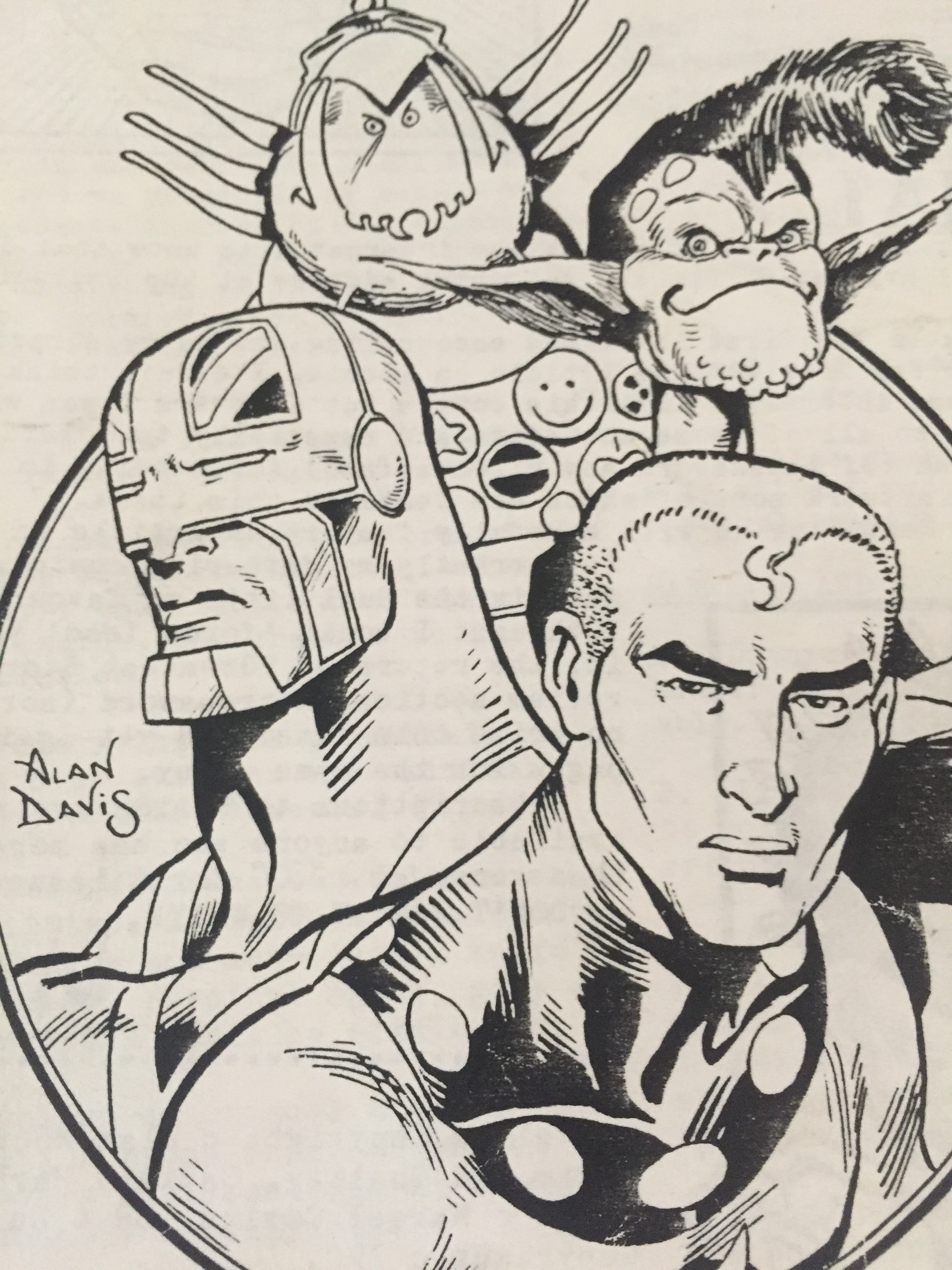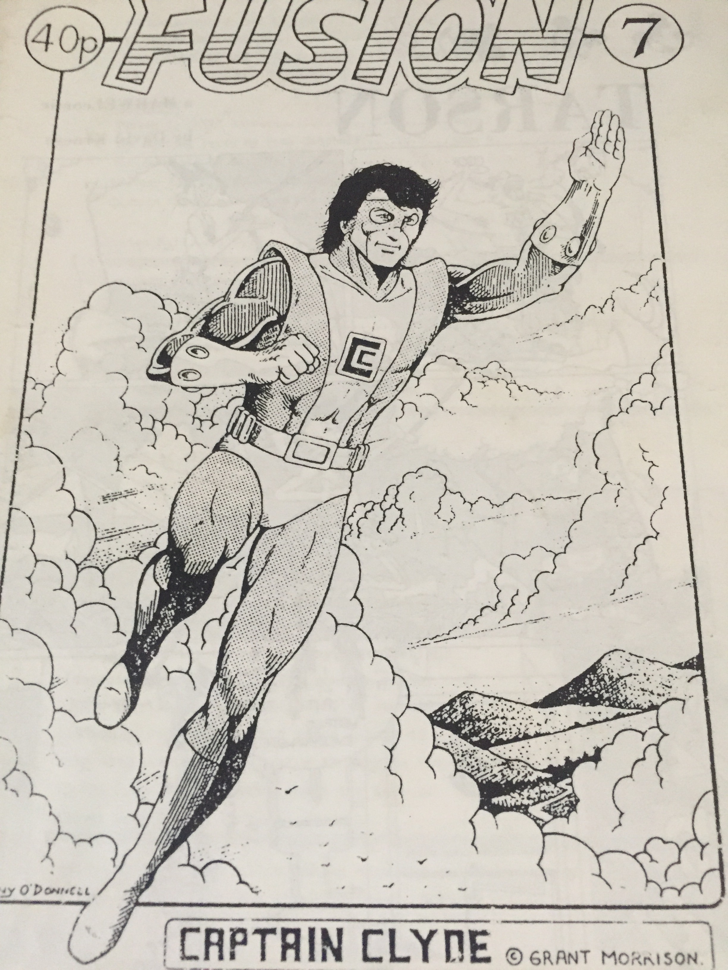 The character had also been inspired by a chat with the then largely unknown Grant Morrison and Tony O’Donnell, hosted by ‘Near Myths’ and ‘Diceman’ artist Graham Manley and organised by future First Minister Jack McConnell. (Tony Foster seated middle, Jack McConnell behind, Graham Manley 6th left, Andy Macfarlane 1st right, Michael Duncan 3rd right in picture below. The cover of the comic they produced (art Graham Manley) is below.
