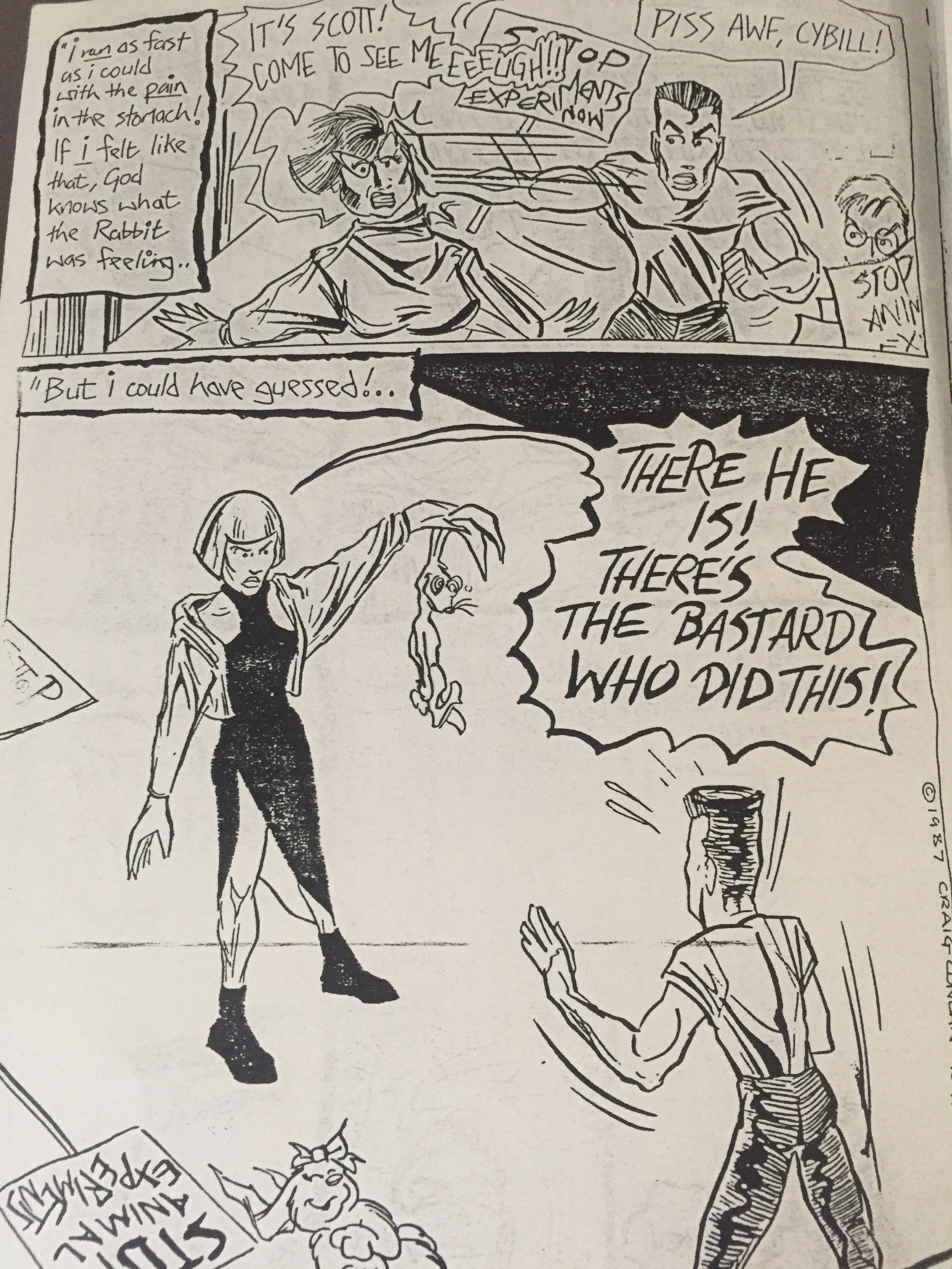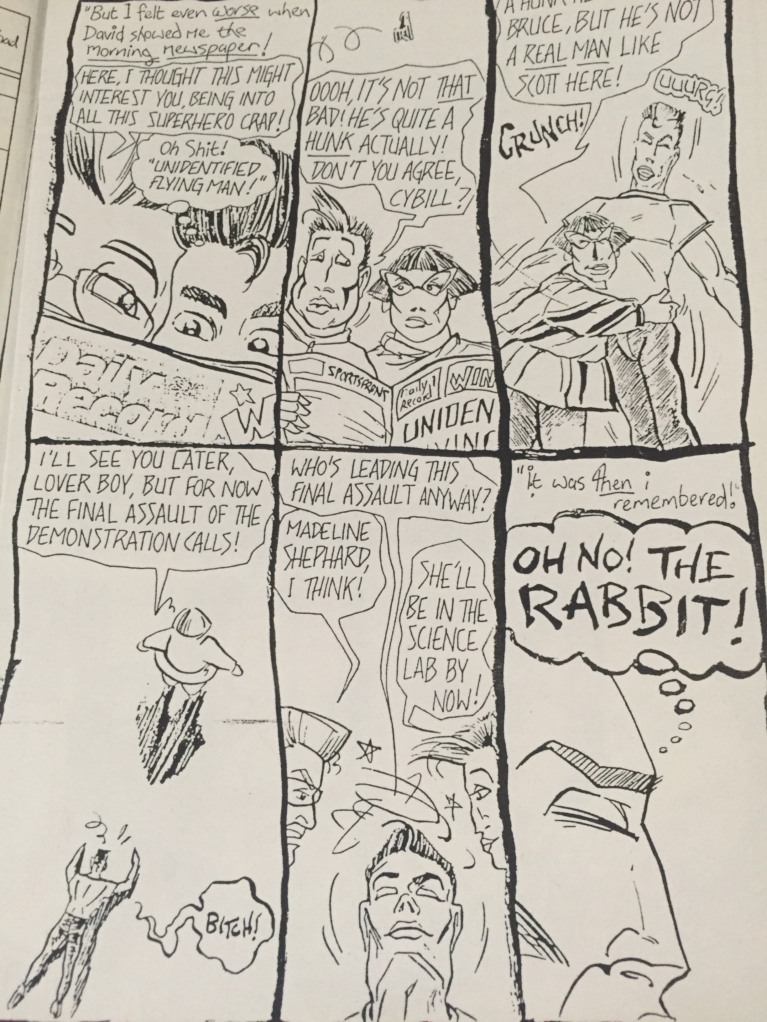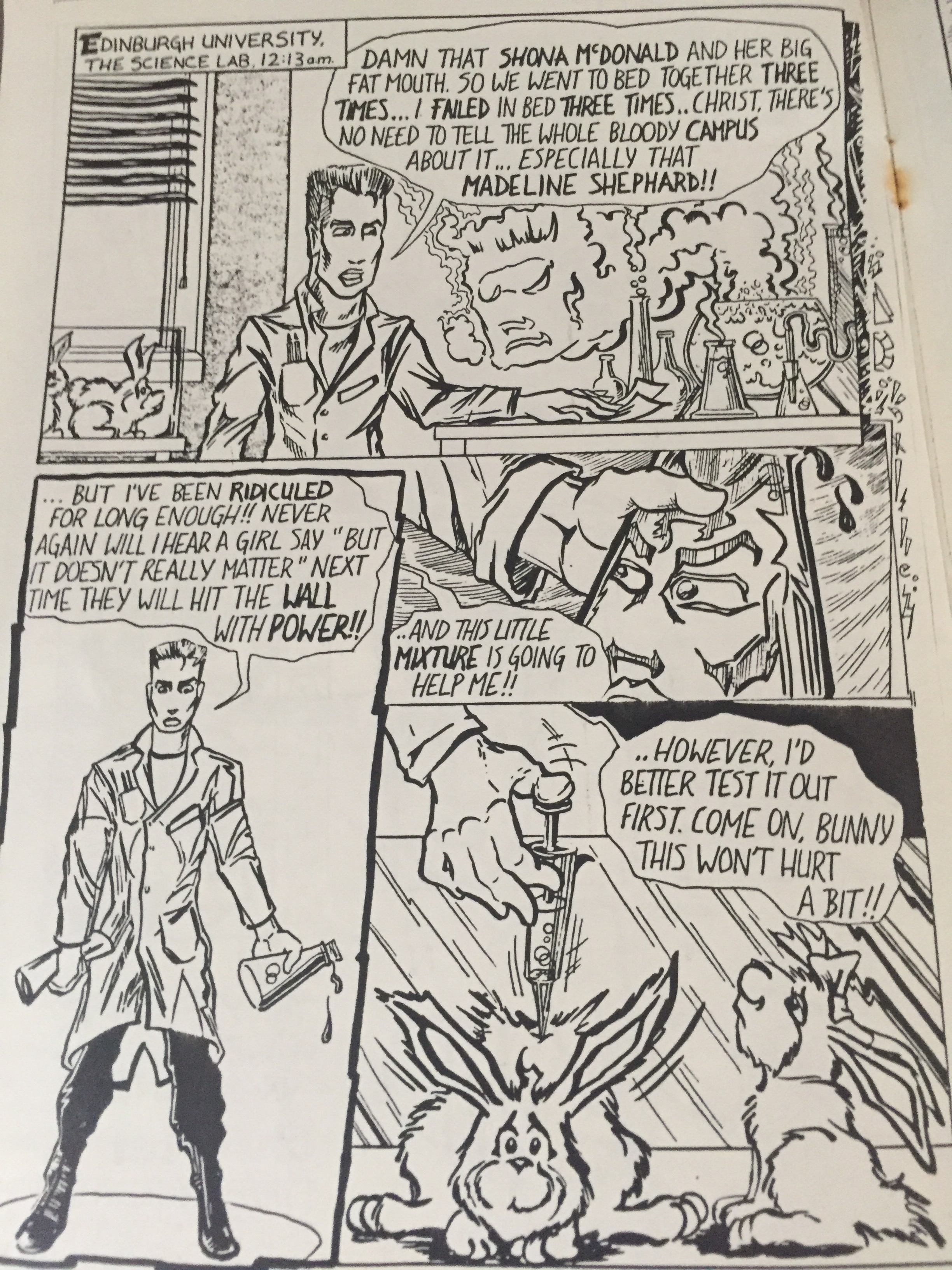 Taking the mickey about boys talking about Sex all the time and introducing some ‘Knockabout Comics’ humour into the mix Captain Scotland’s alter ego Scott Stewart essentially invented viagra ten years before it was commercially available. And similar to viagra, which was actually a side effect from trying to create a blood pressure drug, the side effect of this drug was superpowers. Albeit temporary ones as the rabbit initially injected with the serum died soon afterwards!