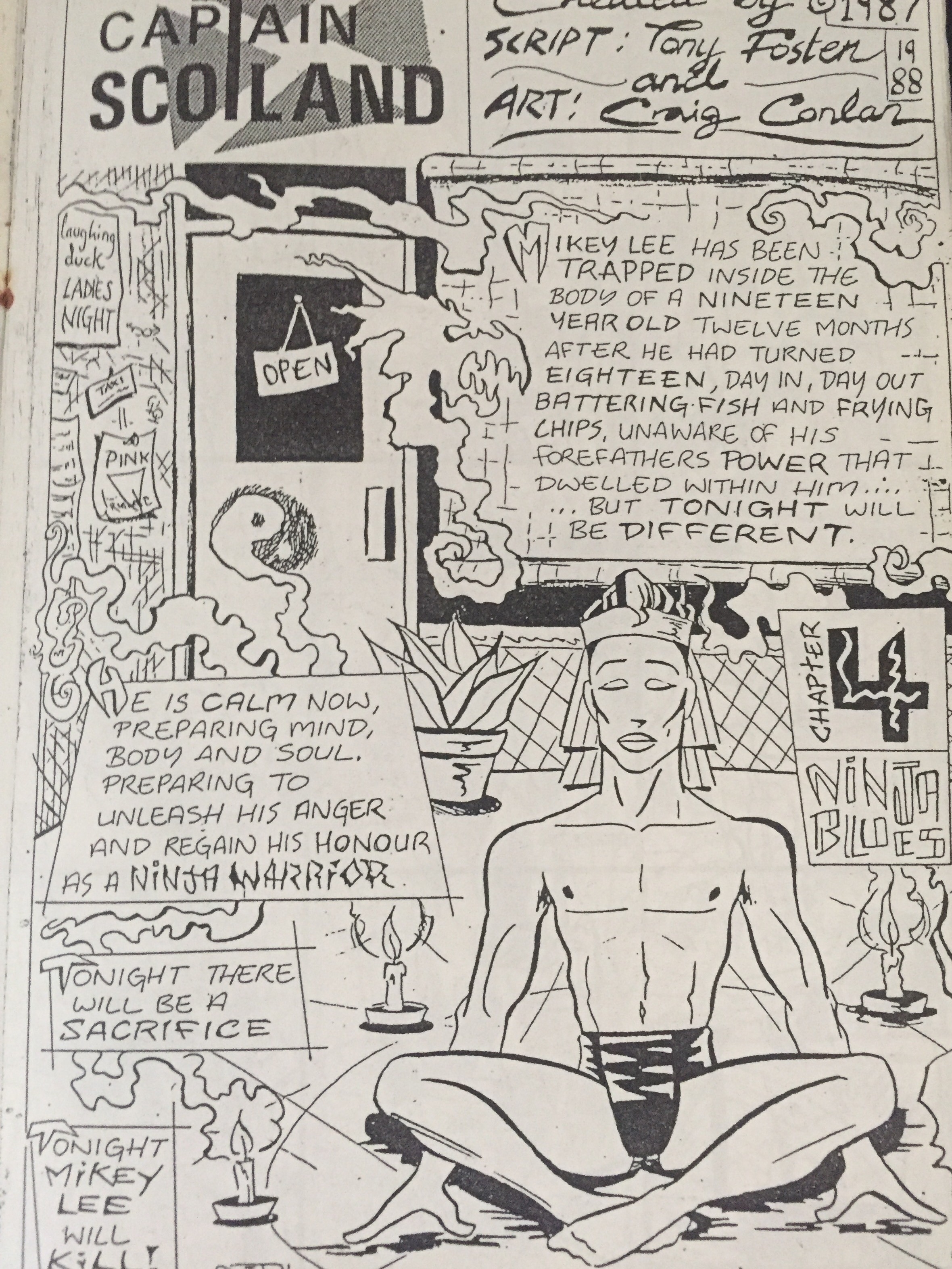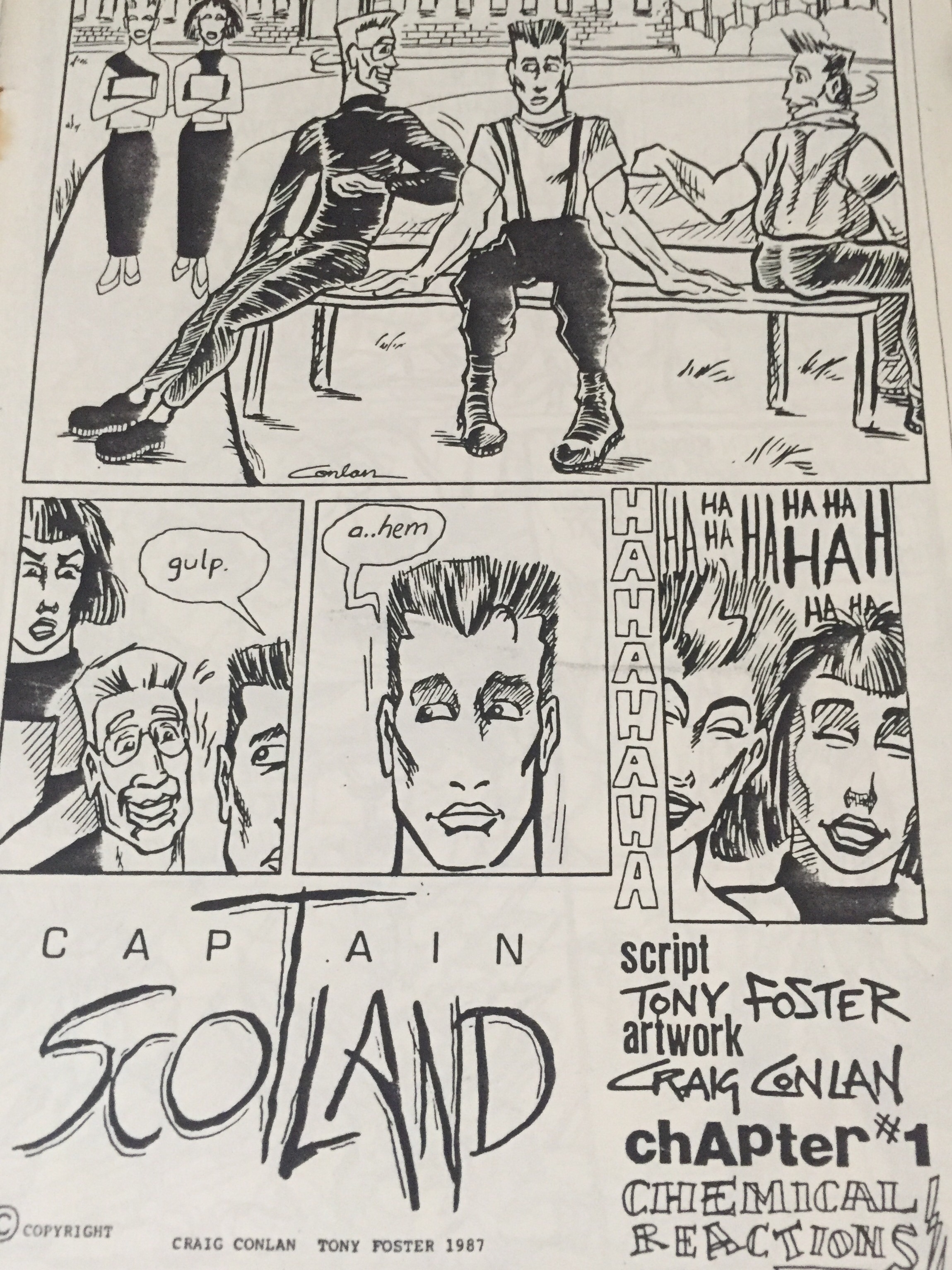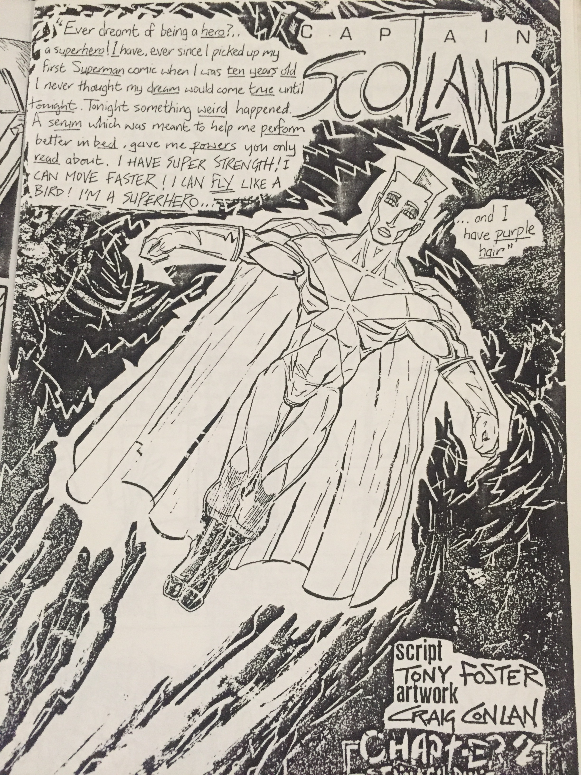 Captain Scotland appeared thirty years ago in the first issue of the well regarded and popular Scottish stripzine Atomic, founded by Tony Foster, Mike Duncan, Andy Macfarlane, Craig Conlan, Eggy Harding and Garry Marshall.