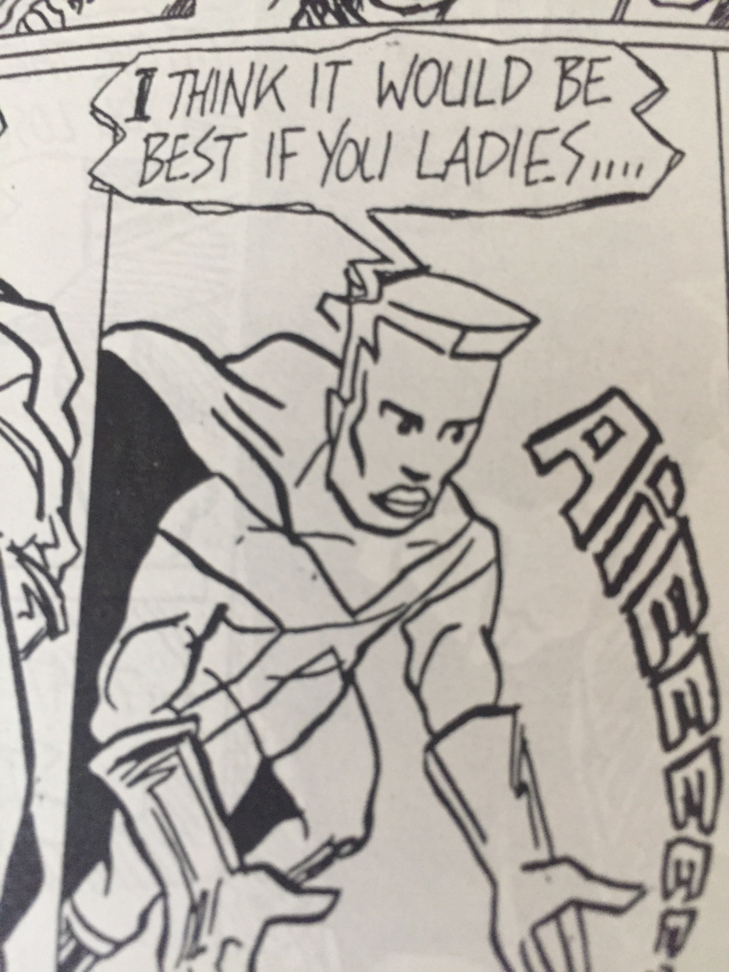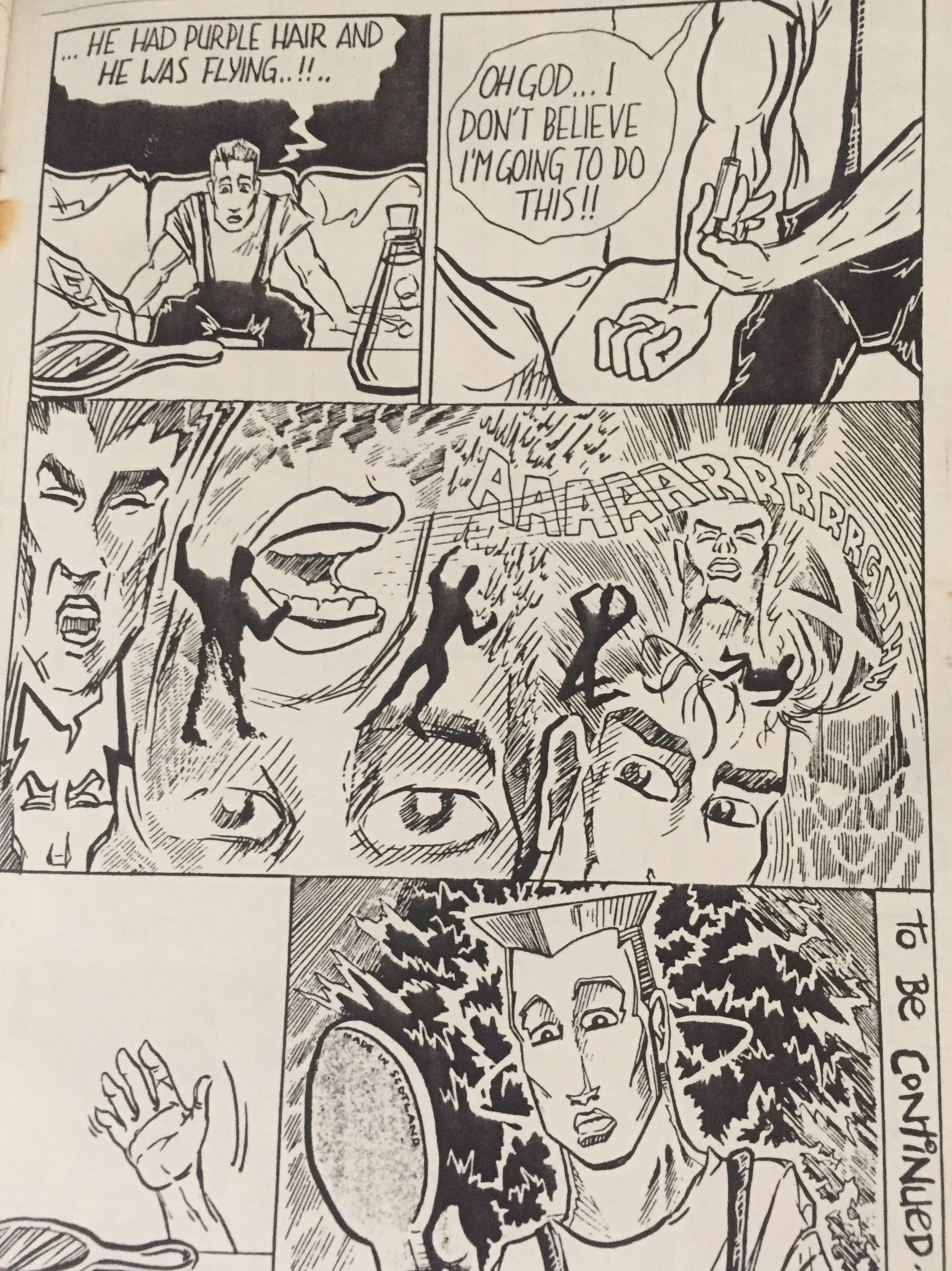 Captain Scotland finally appeared in all his glory in issue 2 page 5. Tony Foster explains, “Craig Conlan pulled out all the stops with a picture that made you go wow! The mask from earlier versions had gone – he looks like Justin Bieber! He had purple spikey hair. Saltire costume. The cape would probably be Green, although with no colour it could be anything you want. I wanted him to look like a thistle – especially in silhouette, so the edge of the cape was to be as spikey as his hair. Craig had none of it though, but I still thought his artwork was absolutely brilliant and captured the character really well. Script wasn’t too bad either.”