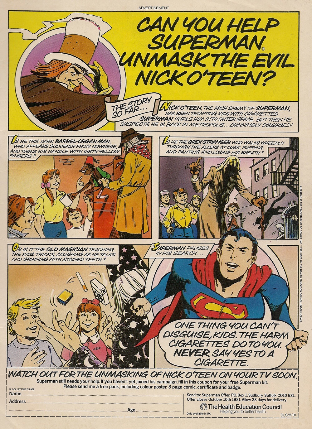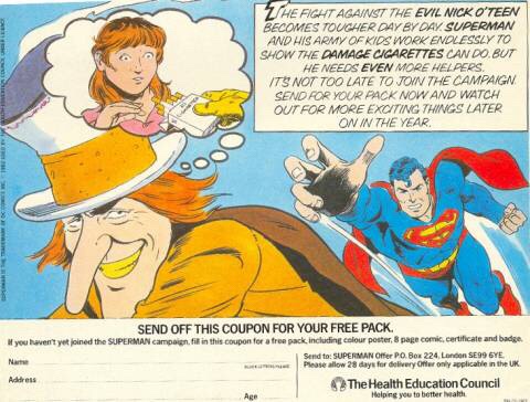 I’ve been a fan of Superman for over 40 years but my earliest memory is not just from films and comics. I was one of 800,000 kids who cut out coupons and sent away for the Health Education Councils Superman Anti Smoking Nick O’ Teen campaign packs. Kids were encouraged to share elements of the pack in their schools and community buildings.