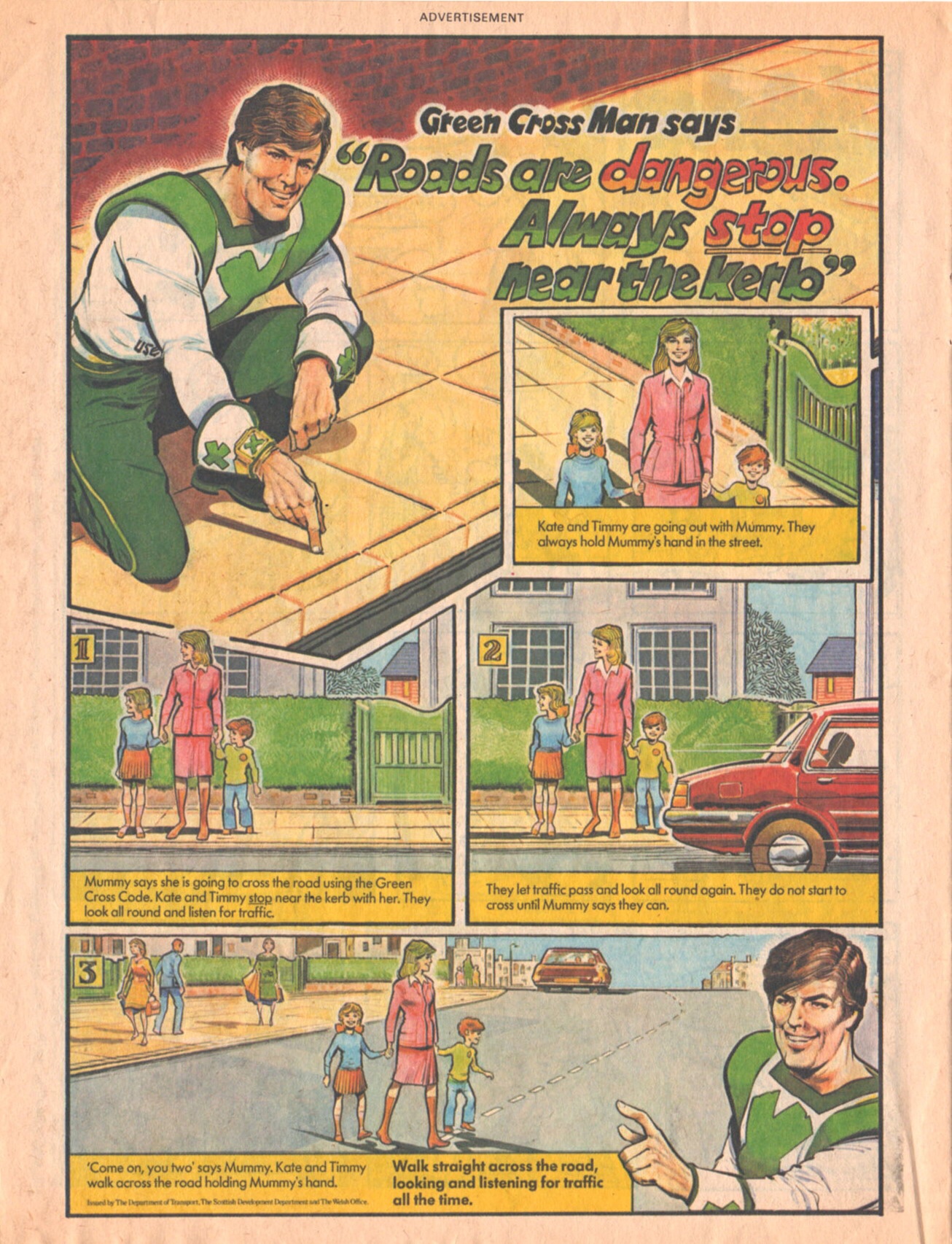 The Riverside Museum in Glasgow recently did a call out to see who the original artist of the Green Cross Code campaign was, for an exhibition they wish to run. It seems the artists included Ron Smith of 2000AD fame, and Dave Gibbons has confirmed he provided the artwork to the strip reprinted at the beginning of this feature (with more nuggets expected in his forthcoming autobiography, hopefully due this year). Perhaps other comic fans have an idea about the other artists?
