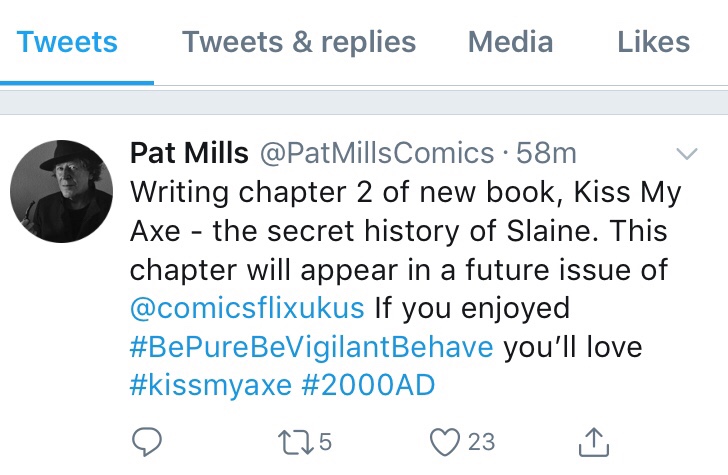 Pat is currently writing ‘Kiss My Axe – the Secret History of Slaine’, following on from his book ‘Be Pure Be Vigilant Behave – 2000AD and Judge Dredd: The Secret History’.