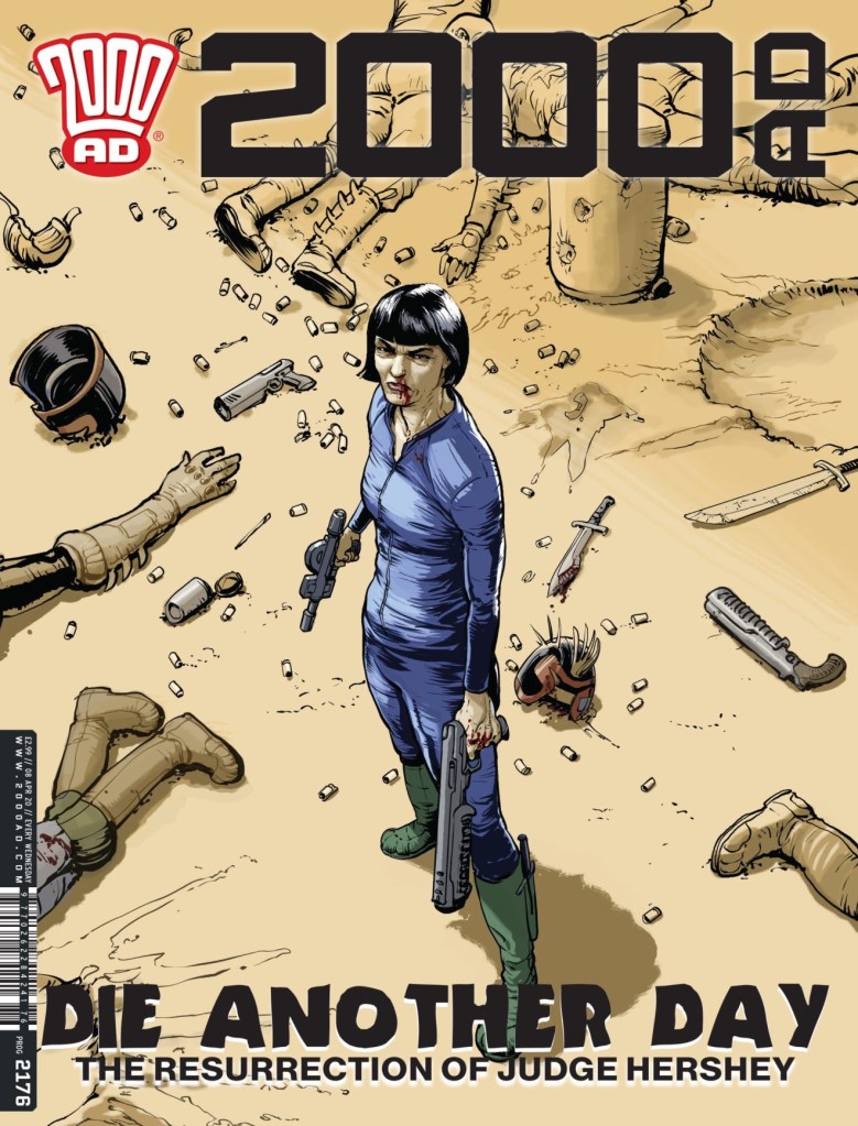 Readers were saddened last year when a microbial virus first forced Hershey to resign her position as Chief Judge of Mega-City One and then apparently took her life in John Wagner and Colin MacNeil’s Guatemala (2000 AD Progs 2150-2157). But all was not as it seemed – Judge Hershey was alive all along and she’s now on a mission of revenge that will take her far beyond the walls of Mega-City One!