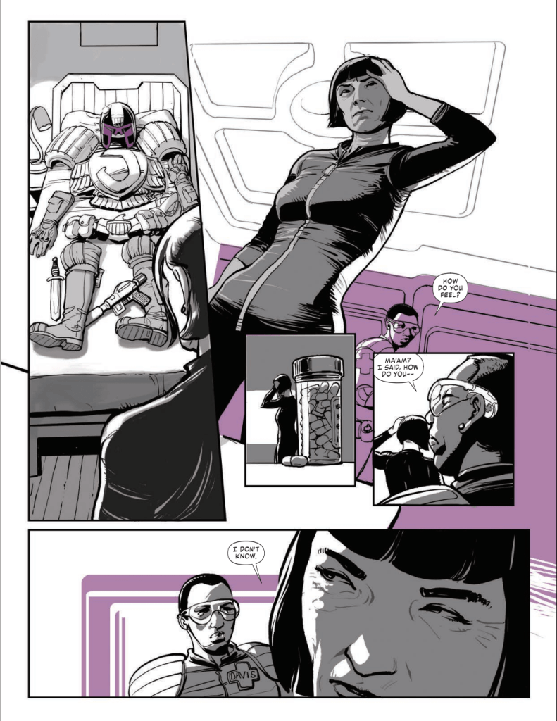 Editor of 2000 AD, Matt Smith, said: “When Hershey stood down as Chief Judge, Rob came to me with the idea of a solo series, with her repairing Smiley’s legacy in the wake of The Small House storyline. John said he had no plans for Hershey, and was happy for us to use her as we saw fit. When John wrote the first episode of Guatemala, he came up with a cover story that would take Hershey out of the game, with no one but Logan, Dredd and a select few others knowing the truth – and Rob worked his scripts in tandem with that. Hershey is still dying – she’s taking medication to stave off whatever microbe she’s been infected with – but she’s going out with the intention of righting wrongs that were done on her watch. Rob and Si’s series is a redemptive, violent, propulsive new arc for Hershey, with lots more surprises still in store.”