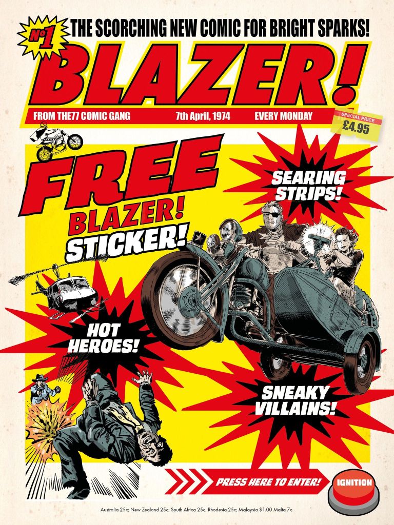 The origins of Blazer lie in ex 2000AD (and more) Editor Steve MacManus’ satirical novel “The Sheerglam Conspiracy”, set within the good old days of British weeklies. Within that book are scripts for an imaginary comic, and these have formed the basis of “Blazer”, touted as a lost 1970s weekly discovered in a Singapore warehouse. All nonsense, of course, but part of the fun.