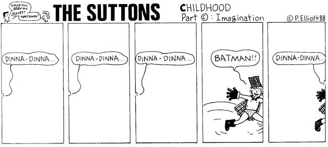 Myself, I’m a fan of newspaper strips. Three or four panels of delightful humour, they can be a real tonic, or they were back in the day, anyway. I used to have tons of collections, from Andy Capp to Bloom County, although I never liked Hagar The Horrible. They could be full of wisdom or just stupid, mostly falling somewhere in the middle, and The Suttons sits comfortably at that table.