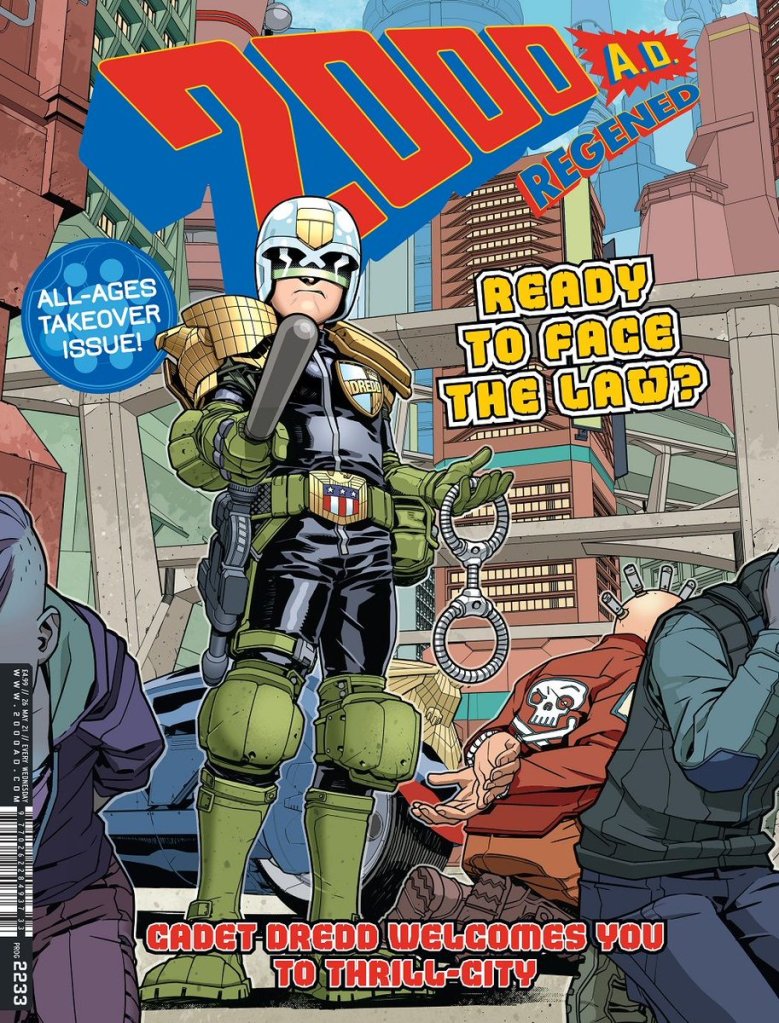 It’s that contentious time of year again, where Rebellion chuck out an issue of 2000AD that for, you know, the kids. Dredd’s still a cadet, Strontium Dog’s still a pup and Devlin Waugh’s demon possessed dildo is notably absent for some reason. There’s a solid section of online naysayers who hate these issues, and their frothing is always fun to read, but personally I tend to enjoy them, only annoyed that the publishers seem unable to schedule them when every story is at a natural end or break. Steve McManus would have sorted it out…