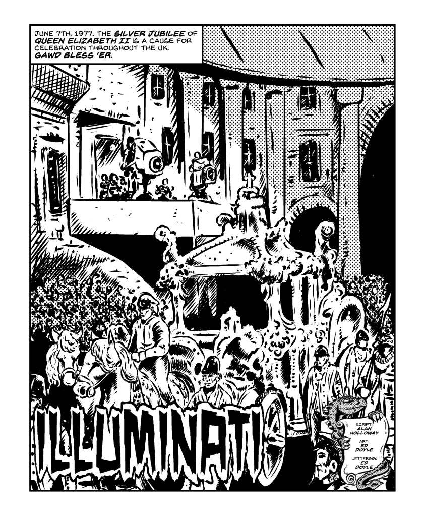 The 80 page (compared to the normal 64) issue features three separate horror tales, with Philthy Luka getting a few pages at the beginning and end of the comic, illustrated by Neil Sims. Ed’s story is “Illuminati”, set during the Silver Jubilee, where he gets to draw The Queen, which must have been fun. “It was like any other portrait,” he says. “Some photo reference, especially for what she wore for her Silver Jubilee. And the ornate carriage she was in. I’m pleased in the way it all turned out.”