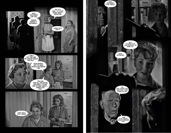 I just love horror movies! I’d also always wanted to make a comic, but I needed to learn how. So I’d watch movies and try to figure out how I would approach adapting them. How can you create creeping tension in a comic without music? Or a jumpscare? How do you lay out actors in a scene when they’re moving around on screen? It became this huge puzzle that I quickly got addicted to. The experiment soon became a format that I thought other horror fans might enjoy. So I cleaned up the crypt a little and opened the doors and Cinecrypt was born.