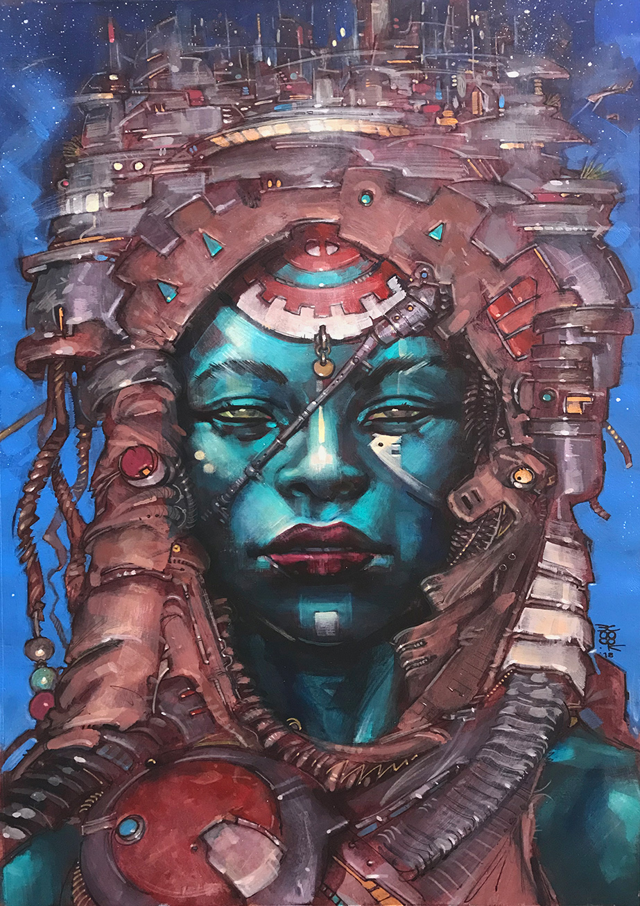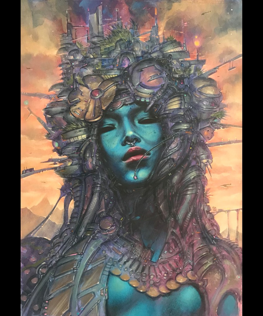Boo Cook: The video showcases my 6×3 feet painting called UMTHEK done on a slab of MDF between February and July 2021. It’s a tip of the hat to the inspirational sci-fi artists of the 70s and 80s – especially those featured in the Terran Trade Authority books. Also, it’s a homage to the blue green women of Vladimir Tretchikoff and the album covers of Malti Klarwein. You can view the video and see the painting here https://youtu.be/9eb99RCu9ok