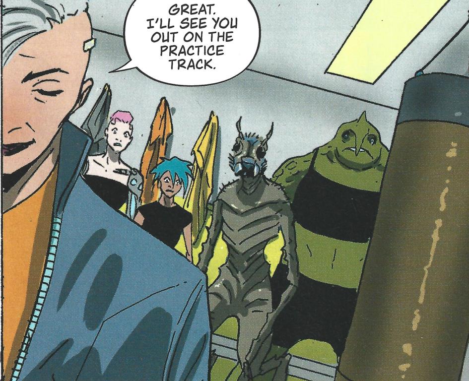 On the face of it “Bladers” has promise – particularly with Leigh Gallagher on art. James “Skip Tracer”Peaty scripts a future sports story, a mysterious benefactor takes over a faded sport team for some mysterious purpose but on the way inspires them to find their mojo again against the odds : much like almost every other 2000AD future sport story. So far this isn’t much different to “Mean Team”, “Mean Arena”, “Harlem Heroes”, “Inferno”, “Second City Blues” etc, but it is early days. 2000AD has these occasional stabs at future sport and they never last long – often makes you wonder why bother? Leigh Gallagher pares back the detail, adopting a looser, less gritty style, but still great art.