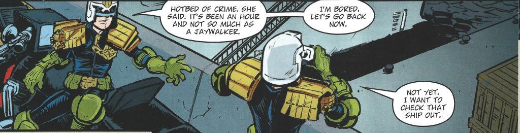 Clone brothers Joe and Rico Dredd, the latter the less earnest of the the two and clearly unaware of the doom that is to befall him are assigned to Black Atlantic division under the supervision of a senior Judge and detect a kind of smuggling operation. New script droid Paul Starkey has a good grip on the characters and the art is cartoony, bright with great story telling ideal for the target audience. The story itself feels bit “Judge Scooby Doo”, “if it wasn’t for you pesky kids” etc.