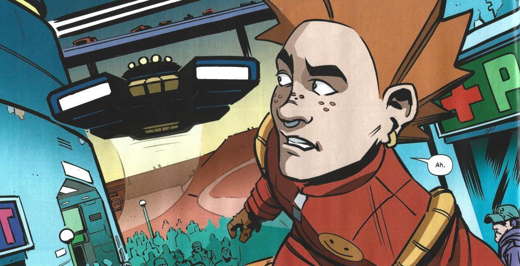 Everyone’s favourite MC1 rebel Marlon “Chopper” Shakespeare returns, continuing from the last Regened ‘Prog. Set before Supersurf 7 but after his scrawling period, Chopper is goaded into breaking a friend out of the cubes. David Barnett and Gary Welsh with colouring by Gary Caldwell break the fourth wall and expand on the Shakespeare family dynamic. The creative team are very talented, but should be allowed to create something fresh, rather than go into the backstory of a Dreddverse character that other writers have already shown has reached his limit of interest.