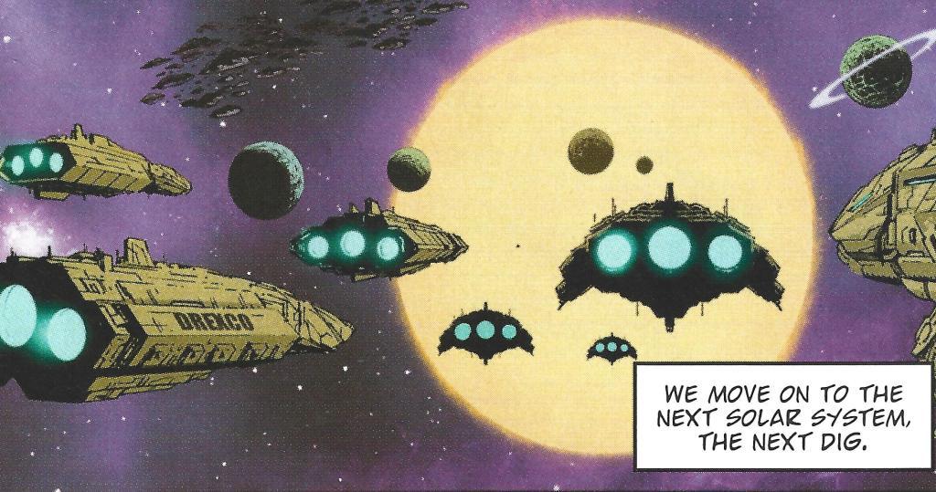 “Future Shocks :The Planet Breakers” by Karl Stock and Karl Richardson follows an Earth mining operation and has a neat twist on the living planet story. Richardsons’ gritty art and moody characters doesn’t fit in with the rest of content of the Prog’. It feels incongrous in this company.
