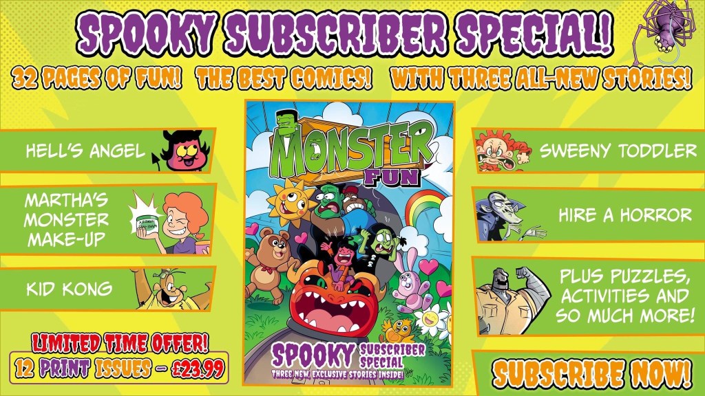 Monster Fun is going monthly. Have you checked out the Monster Fun SPOOKY SUBSCRIBER SPECIAL? Only available with Monster Fun subscriptions – starring Hell’s Angel, Sweeny Toddler, Frankie Stein, and more!