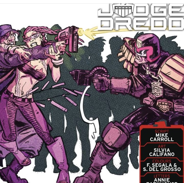 It’s a one off Dredd this week by Michael Carroll and Silvia Califano and it has all the elements of a Dredd story I like. Jinty Pink is the wrong girl in the wrong place at the wrong time who ends up on prime time TV after saving Dredd life. She then proceeds to find herself supporting and then dissing the judges in a media storm.