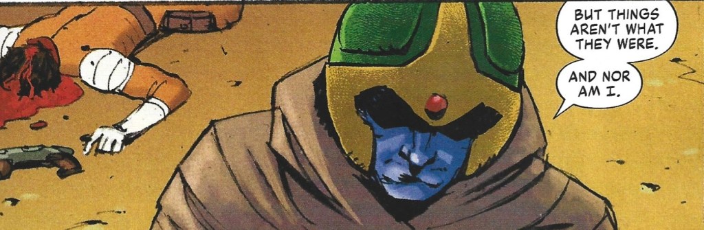 Rogue / Dog, features by the much derided (but also poorly served) Friday incarnation of Rogue Trooper and is the second of the Strontium Dog mash ups. Friday is a search destroy agent out for revenge accompanied by the spirits of 3 fallen comrades. With its “western” setting and despite references to the original GI strip, its more Stront than Rogue. Rising starNicolo Assirelli supplies bold and unfussy art ably assisted by colourist Jack Davies