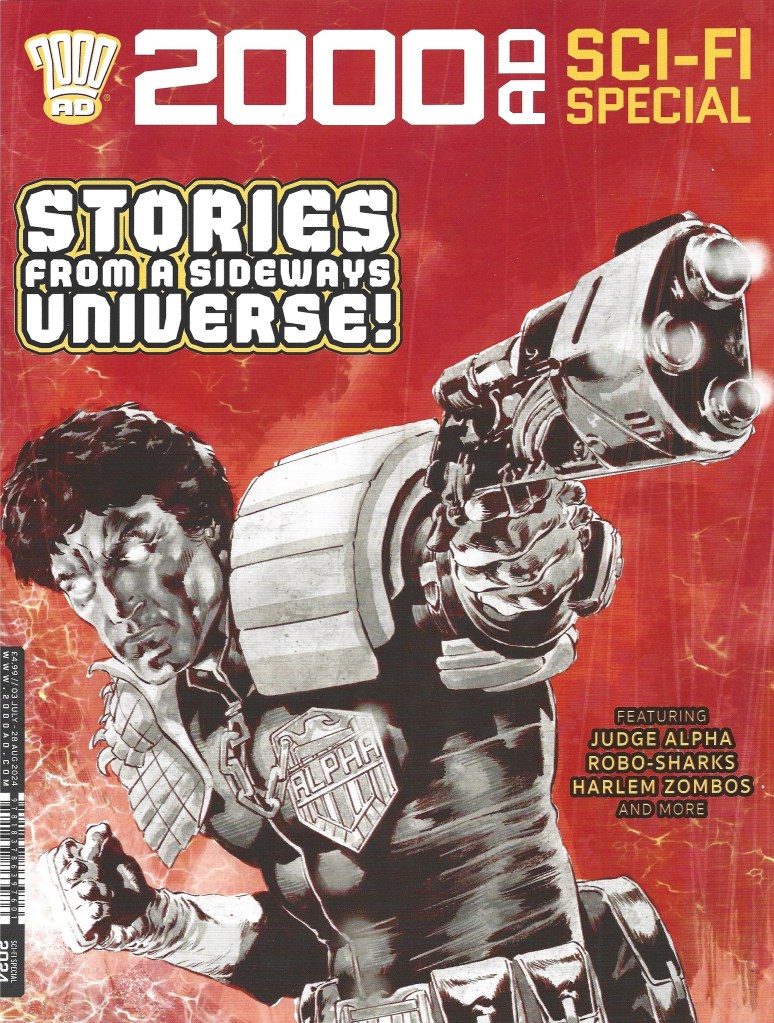Its summer (occasionally) and the 2000AD Sci Fi Special is here again. Your reviewer is glad that the Mighty One resurrected these extra little bonus packages of seasonal thrillpower, one off strips united by a theme, or a crossover. Billed as “Stories From A Sideways Universe”, what it is in reality is a package of paired off and mashed up 2000AD strips. This isn’t the first time Tharg has pulled this stunt, but it has been a few years since the last one. Tharg’s Sci Fi Special’s have travelled a rocky road over the past few few years, so the prospects for this one weren’t good.