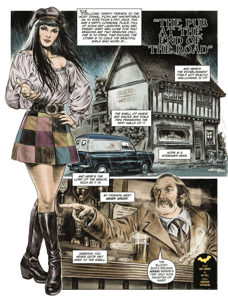 was commissioned to bring her to life, and famously based Misty on her own image, providing a series of sketches and paintings that would be used throughout the weekly comics and later annuals. A beautiful, witch-like character, Misty welcomed readers to each issue and acted as a kind of spirit guide, providing reassurance and signing herself ‘Your friend’. Jack Cunningham hand-lettered these welcomes and devised the bat and moon logo for the comic’s cover.