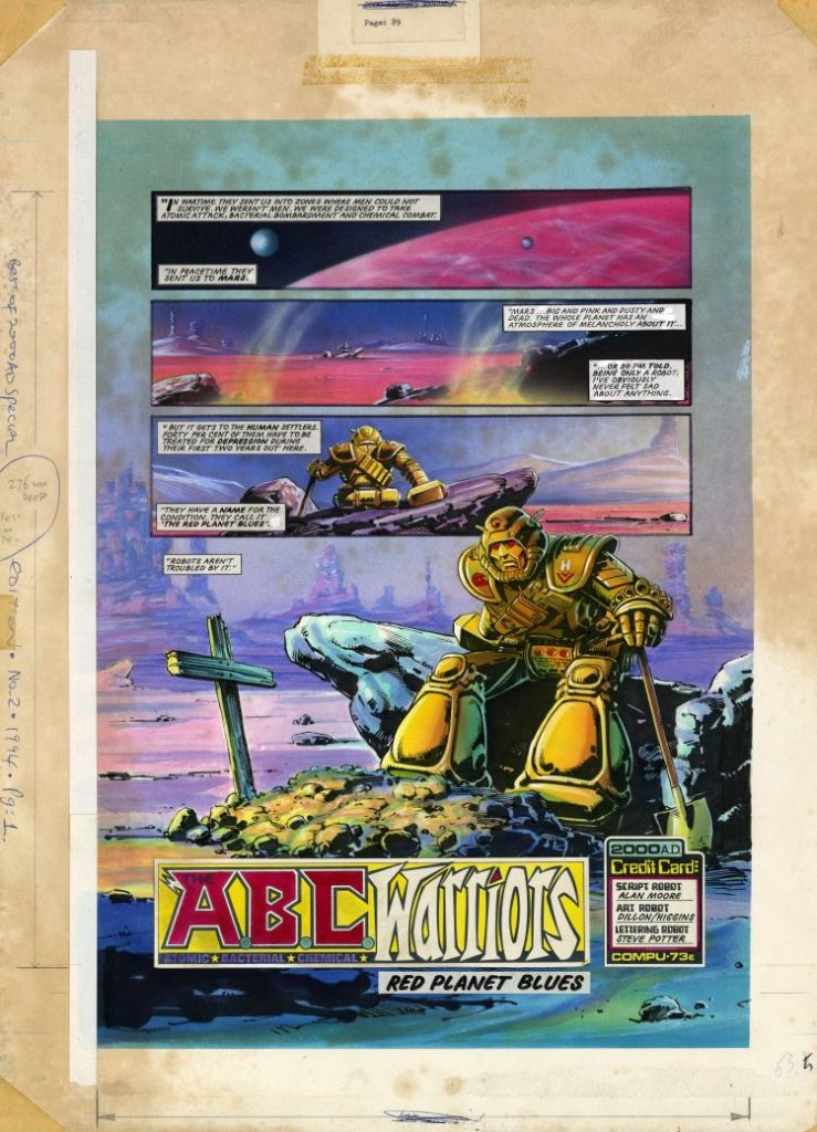 Dillon was not known for his painted work, but nevertheless there are examples present, covers (like his Best of 2000AD cover for “Cry of teh Werewolf”),trading card art and some rare painted strip work (“Oz”) There are unlettered, Wendy Simpson coloured pages of “Emerald Isle” Dillon’s first work with long term collaborator Garth Ennis on Dredd that would lead to bigger things. Once you get past Dredd, there is work from Mean Area, Abelard Snazz. The jewel in the crown, his collaboration with Alan Moore and John Higgins on “Red Planet Blues” the only ABC Warriors story not written by Mills, is here in its entirety, and it’s beautiful. Examples of “Friday“ era Rogue Trooper pages demonstrates where his art could save a poor script, making a silk purse out of a sow’s ear. It’s fascinating to see the development and growth of Dillon as an artist over his stay at the Galaxy’s Greatest. If there is a criticism, it’s the lack of an introduction and commentary which seems like an oversight.