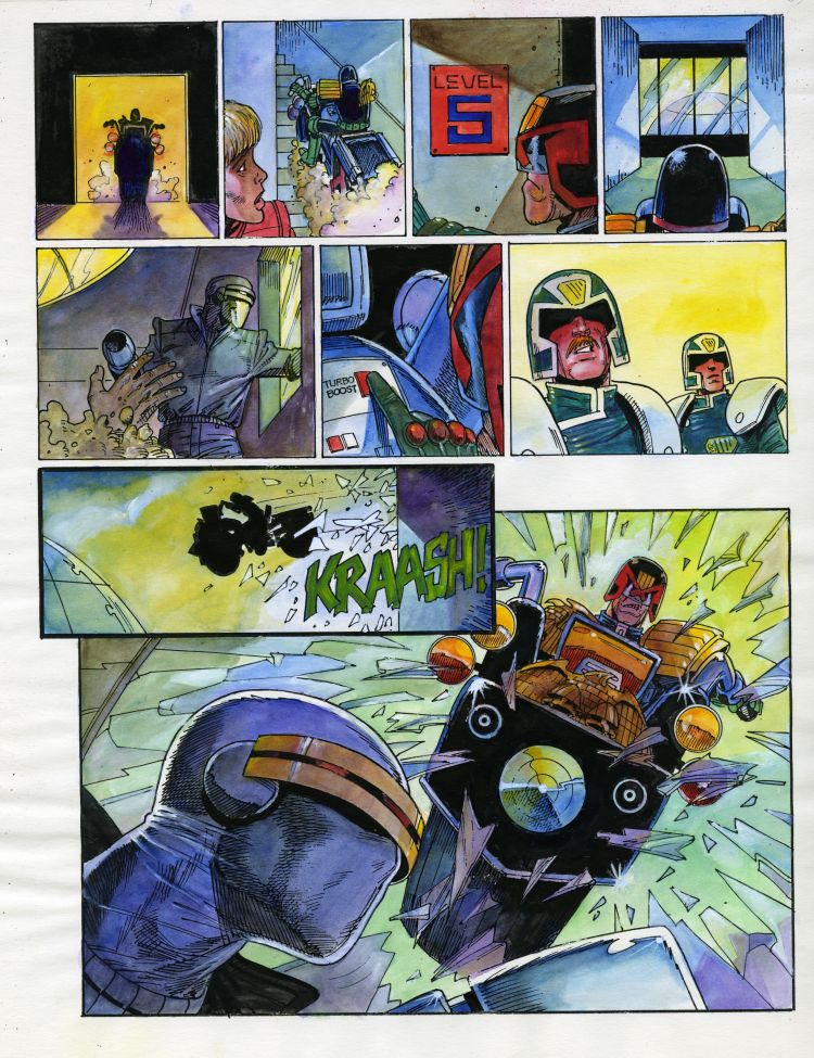 Get past the wonderful sleeve images of a Zenith and Rogue Trooper cover and the contents page, the reader is presented with pages from early Dredd strips such as his weekly JD debut and classic “ Alone in a Crowd”. From the get-go you see Dillon’s trademark facial expressions, the solid figure work, the easy panel layouts and action. The bigger size makes you appreciate how powerful and brilliant these early Dredd pages are, the drama of “Block Mania” the action and dynamism of the much celebrated “Cry of the Werewolf”.