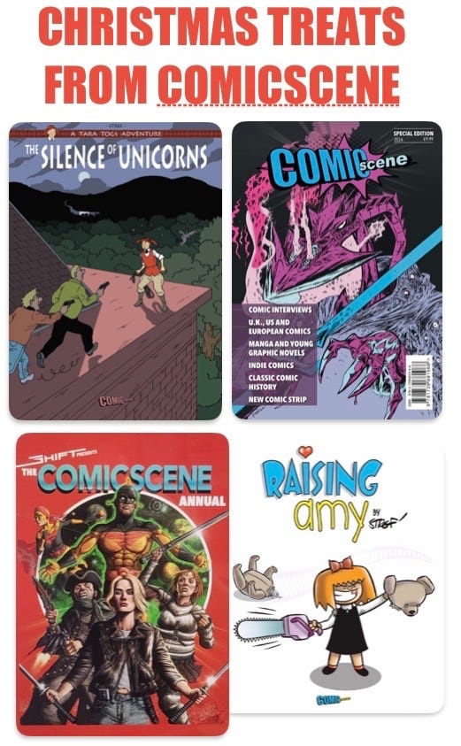 For Christmas this is the final weekend to order the hardback version of the ComicScene Annual too. Only £12.99 in hardback. Order by 25th November to guarantee Christmas delivery – the book is also available in softback at £8.99. Get it here. Full details of contents are at the link too. The cover is by Charlie Gillespie and is a homage to the 2000AD Annual 1982. The cover was designed by Robin Smith and illustrated by Brian Bolland. A book about Robins designs will be out next year.