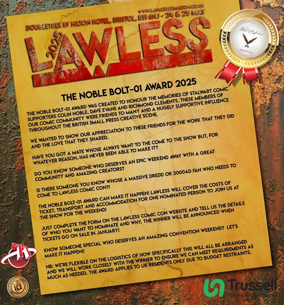 Head on over to https://lawlesscomiccon.co.uk/the-noble-bolt-01-award/ to complete the form with your nomination! You can help someone get to the conference in May 2025 which is attended by the likes of Brian Bolland and John Wagner.