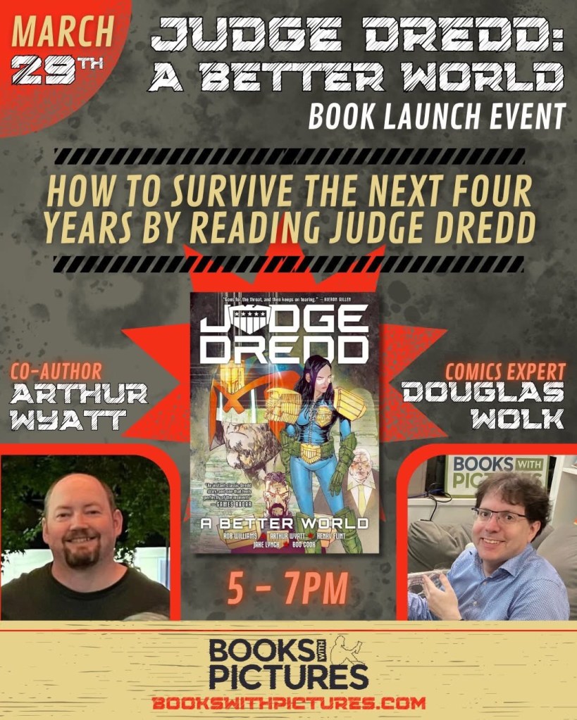 Earthlets of Portland! On 29th March Judge Dredd writer Arthur Wyatt will be joining comics critic Douglas Wolk at Books with Pictures to guide you through surviving the next few years of… everything… with the help of 2000 AD. Don’t miss it!