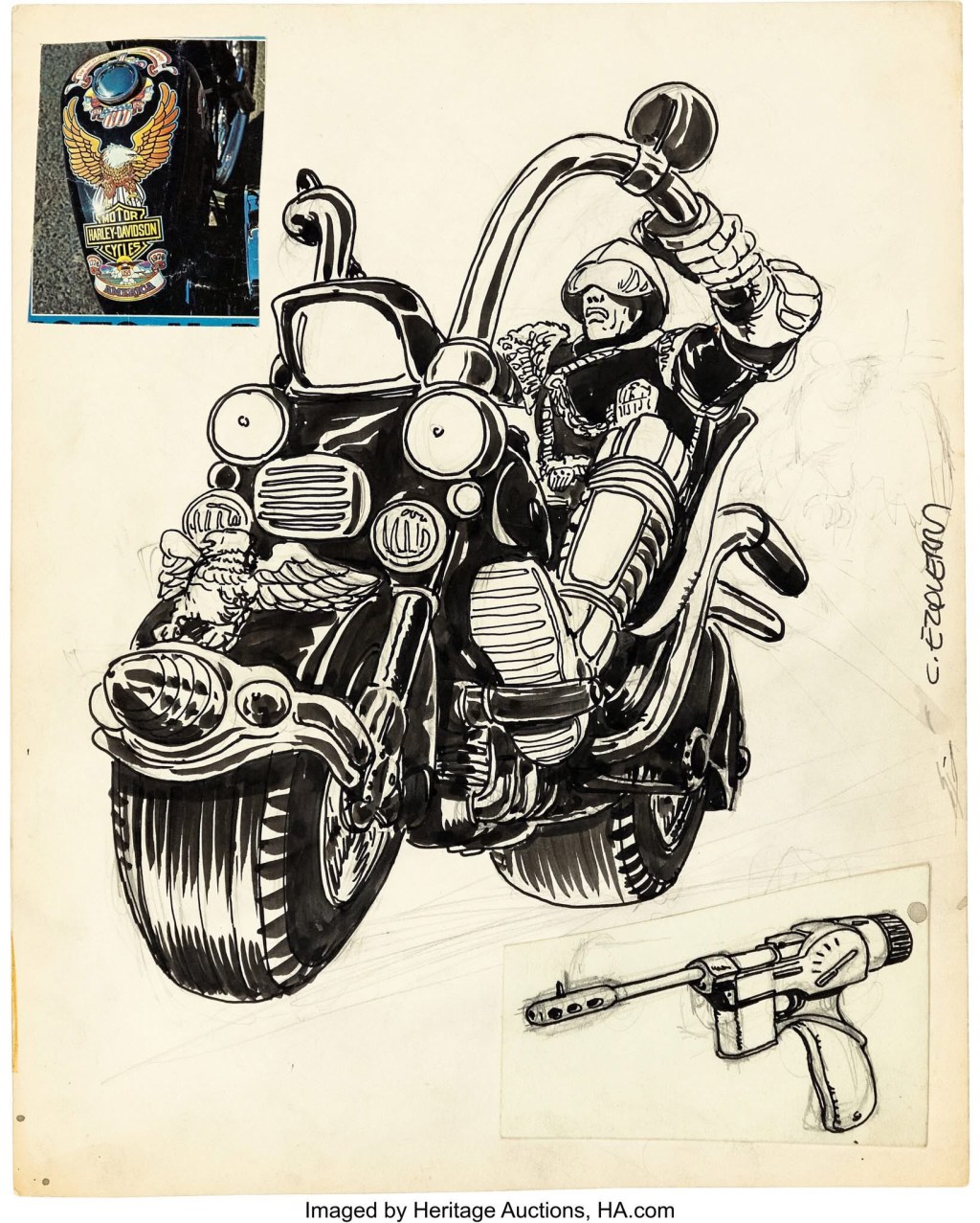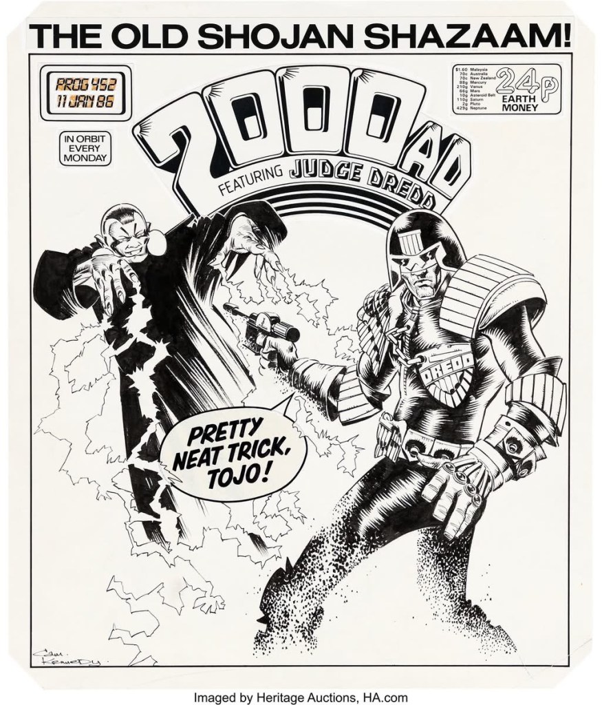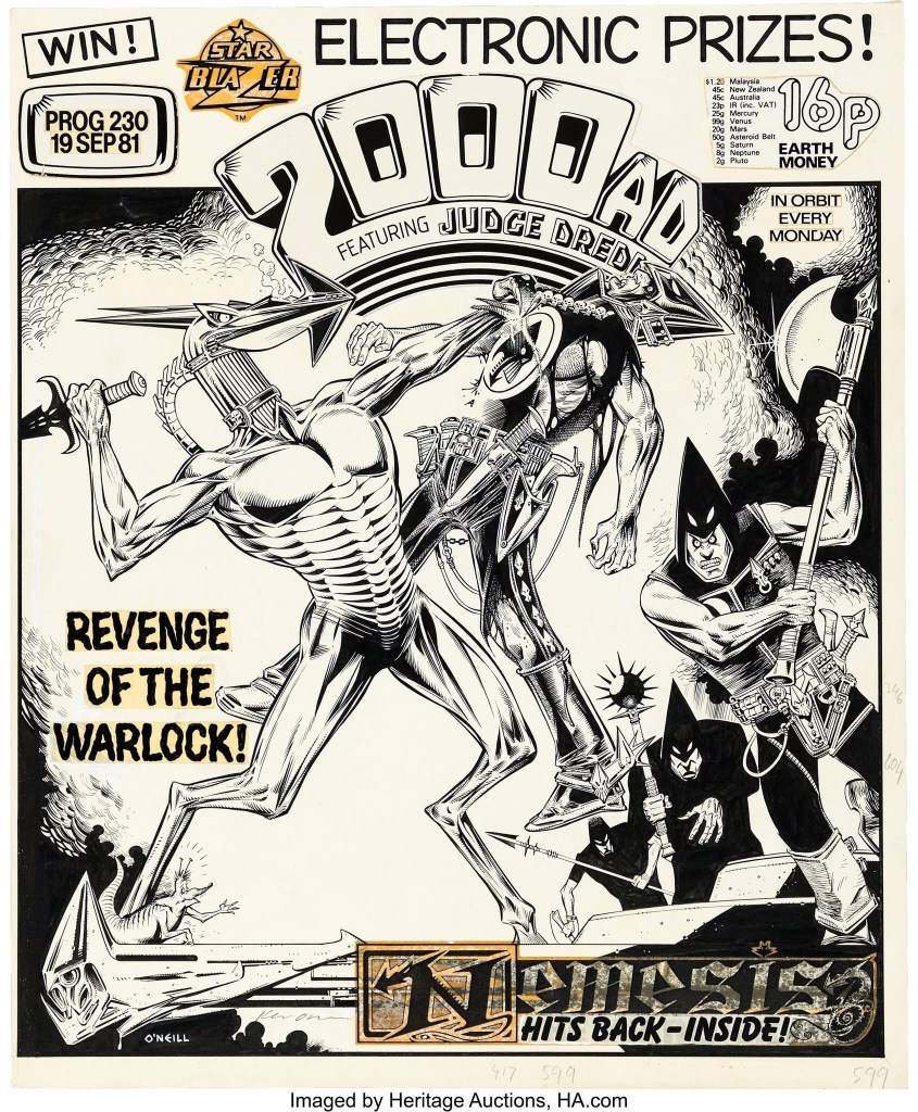 This classic Ezquerra concept sketch of Dredd sold for a whopping $50,000 at the Heritage auction this weekend. Other art under the hammer included a Kevin O’Neill Nemesis cover for $18750 and Cam Kennedy Judge Dredd cover for $10,000.