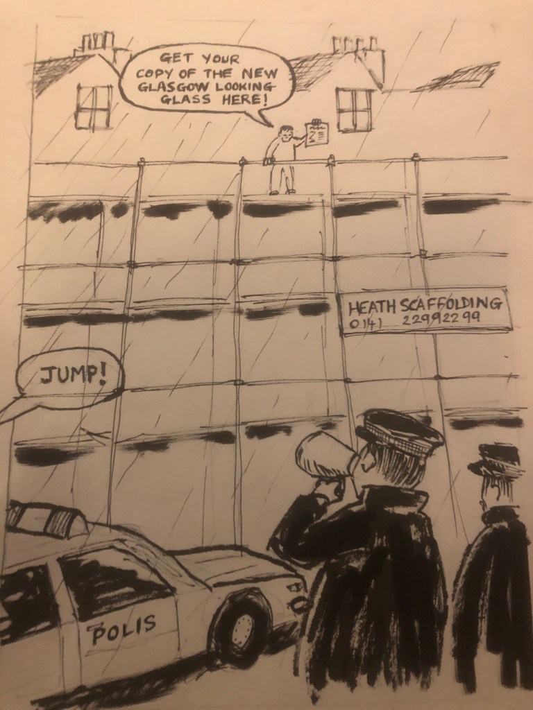 The Glasgow Looking Glass launch was postponed today due to a police incident in Glasgow. Artist Colin Maxwell drew a sketch about the incident. Some of the participants headed off to a local hostelry for lunch, to talk comics and wonder how many sketches you could get out of the day for the next Looking Glass!