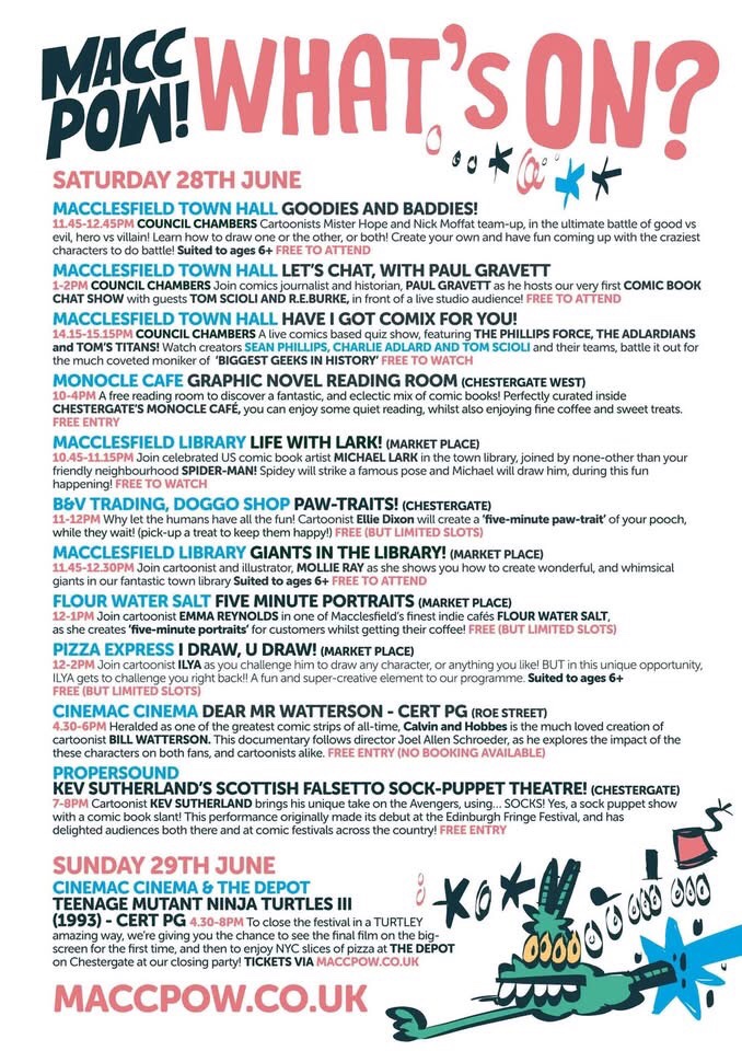 Join them for MACC-POW! A full weekend of FREE and ticketed events celebrating comics and comic art in the very heart of Macclesfield. A truly unique event for the town that brings together both local and international comic creators! Get up-close and personal with legendary comic professionals and the bright stars of the future, as they celebrate this wonderful world with a diverse mix of amazing comic creators.